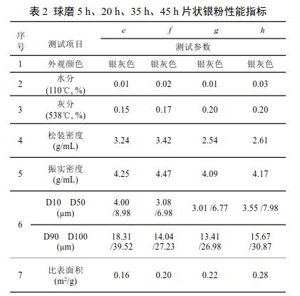 由表1結合圖1可知,反應時間2min、4min制備得到的原始銀粉主要以團聚體形式存在,而反應時間6min、8min則主要以花簇狀團聚形式存在。同時可以看出反應4min制得的原始銀粉其粒徑大小、振實密度適中;2min制得的原始銀粉振實密度小,比表面積大,吸油量大,不適用于高振實高銀含量的導電膠體系;反應6min和8min制得的原始銀粉,其粒徑大,球磨制得的片狀銀粉粒徑在10μm以上,雖然其均表現(xiàn)出較高振實密度,但是其在連續(xù)點膠或絲網印刷等施膠過程中會存在堵孔或網的問題,影響連續(xù)施膠。因而,我們選用反應4min制得的原始銀粉進行后續(xù)球磨實驗。表1反應2min、4min、6min、8min原始銀粉性能指標
