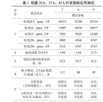 由表3可知,球磨20h、35h片狀銀粉制得IC封裝導電銀膠點膠效果好,無明顯拉膠現(xiàn)象;45h的制得導電銀漿點膠存在尖頭和拉膠現(xiàn)象。同時可以看出,20h的片狀銀粉觸變指數(shù)低,導電銀膠需要有良好觸變特性便于點膠;45h的片狀銀粉觸變指數(shù)高;而且可以看出35h、45h制得的導電膠的線條電阻值較小。這三款產品推力測試、固化后硬度測試、高低溫冷熱沖擊測試及高溫高濕測試均滿足應用。綜合上述各項指標,球磨35h制得的片狀銀粉制得的導電銀膠均達到了應用指標要求。