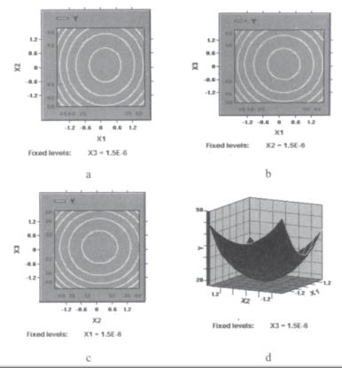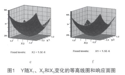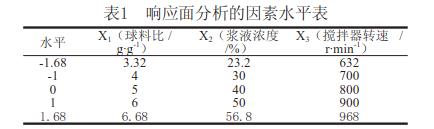 利用響應面分析法[1]化枸杞子渣超微粉碎工藝參數(shù)。在單因素預試驗基礎(chǔ)上,用SAS軟件系統(tǒng)進行響應面分析,設(shè)計一個三因素五水平的回歸方程來擬合因素和指標(響應值)之間的函數(shù)關(guān)系。選擇球料比(X1)、枸杞子渣漿液濃度(X2)和攪拌器轉(zhuǎn)速(X3)作為因素,以粉碎后的顆粒粒度d50作為響應值對球磨機濕法超微粉碎工藝進行化。