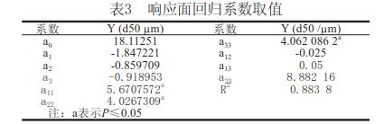 從表3看出:方程的相關(guān)系數(shù)R2值達到了0.8838,表明方程的自變量和因變量之間的回歸效果顯著,可用于對試驗進行分析。二次項中球料比、枸杞子渣漿液濃度和攪拌器轉(zhuǎn)速對顆粒的d50影響效果為顯著(p<0.05)。由圖1可得出佳超微粉碎工藝條件為:球料比5,枸杞子渣漿液濃度40%,攪拌器轉(zhuǎn)速800r/min。在此佳工藝條件下顆粒d50為18.2µm